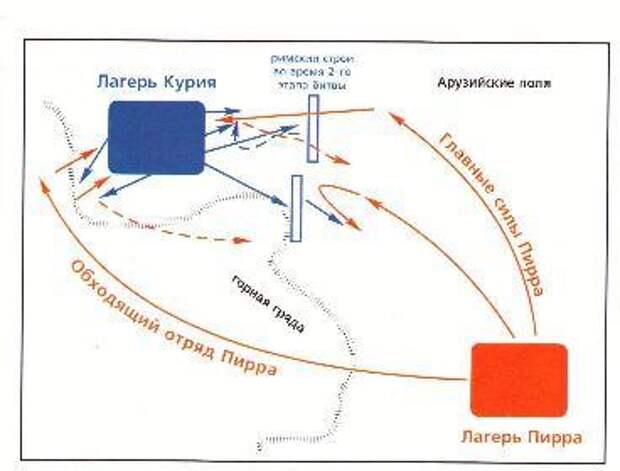 Узнав, что римляне остановились неподалеку за рекой Сири-сом, Пирр верхом отправился к реке на разведку, осмотрел охрану, расположение и все устройство римского лагеря. Увидев царивший повсюду порядок, он с удивлением сказал своему приближенному Мегаклу, стоявшему рядом: «Порядок в войске у этих варваров совсем не варварский. А каковы они в деле — посмотрим». И уже опасаясь за дальнейшее, он решил дождаться союзников, а на тот случай, если римляне попытаются перейти реку раньше, поставил стражу, чтобы помешать переправе. Но римляне начали переходить реку сразу в нескольких местах, так что греки, боясь окружения, отступили. Узнав об этом, Пирр встревожился еще больше и приказал своим военачальникам построить пехоту и держать ее в боевой готовности, а сам во главе трех тысяч всадников напал на строящихся после переправы римлян. Во время битвы красота его оружия и блеск роскошного убора делали его заметным отовсюду, и он делом доказывал, что его слава вполне соответствует его доблести, ибо, сражаясь с оружием в руках и храбро отражая натиск врагов, он не терял хладнокровия и командовал войском так, словно следил за битвой издалека, поспевая на помощь всем, кого одолевал противник.