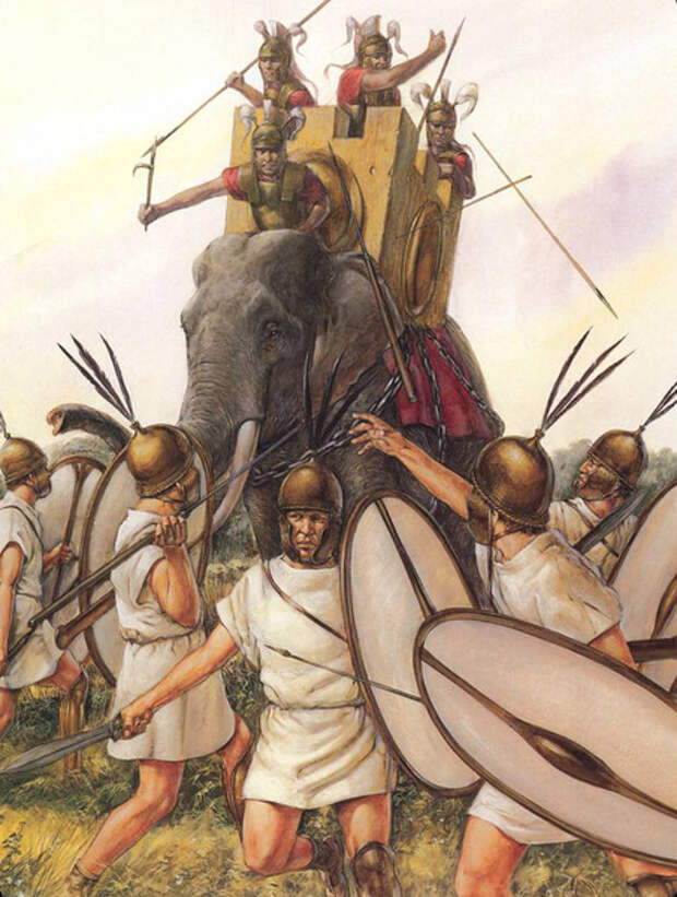 Как только из Тарента прибыли грузовые суда, Пирр в 280 г. до Р.X. погрузил на них 20 слонов, 3000 всадников, 20 000 пехотинцев, 2000 лучников и 500 пращников. После того как все было готово, он отчалил, но когда корабли вышли на середину Ионийского моря, их понес необычный для этого времени года бурный ветер. Благодаря храбрости и расторопности гребцов и кормчих кораблю Пирра удалось приблизиться к берегу. Опасаясь, что корабль будет разбит, Пирр бросился в море, а приближенные и телохранители немедленно кинулись его спасать. Однако в темноте среди огромных волн Трудно было оказать ему помощь, и только на рассвете, когда ветер стих, Пирр выбрался на сушу, изможденный телом, но бодрый духом. Мессапы, на землю которых его вынесло бурей, по мере сил оказали ему помощь и подвели к земле немногие уцелевшие корабли, на которых было несколько десятков всадников, меньше двух тысяч пехотинцев и два слона.
